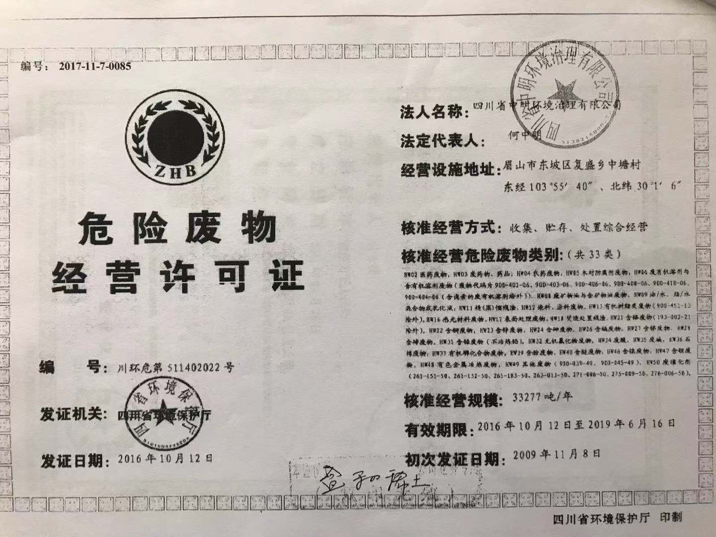 四川欣欣环保科技有限公司处理资质