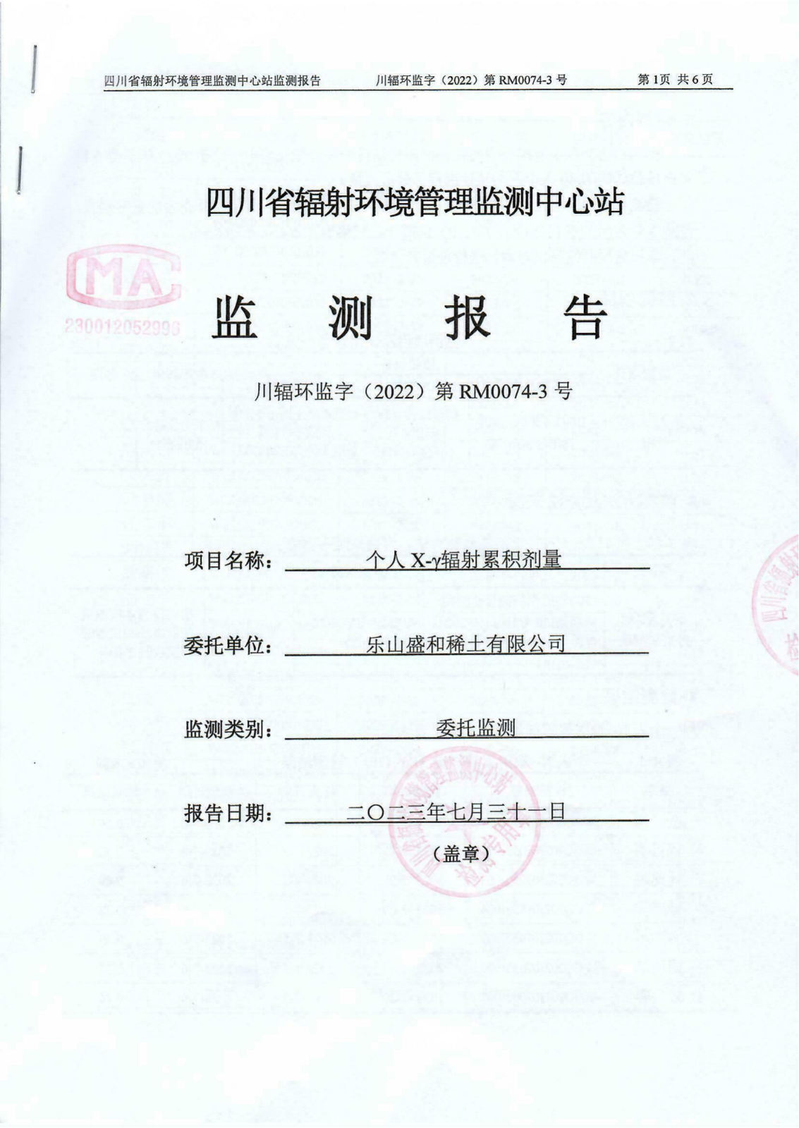 2023年二季度乐山盛和个人X-y辐射累积剂量监测报告