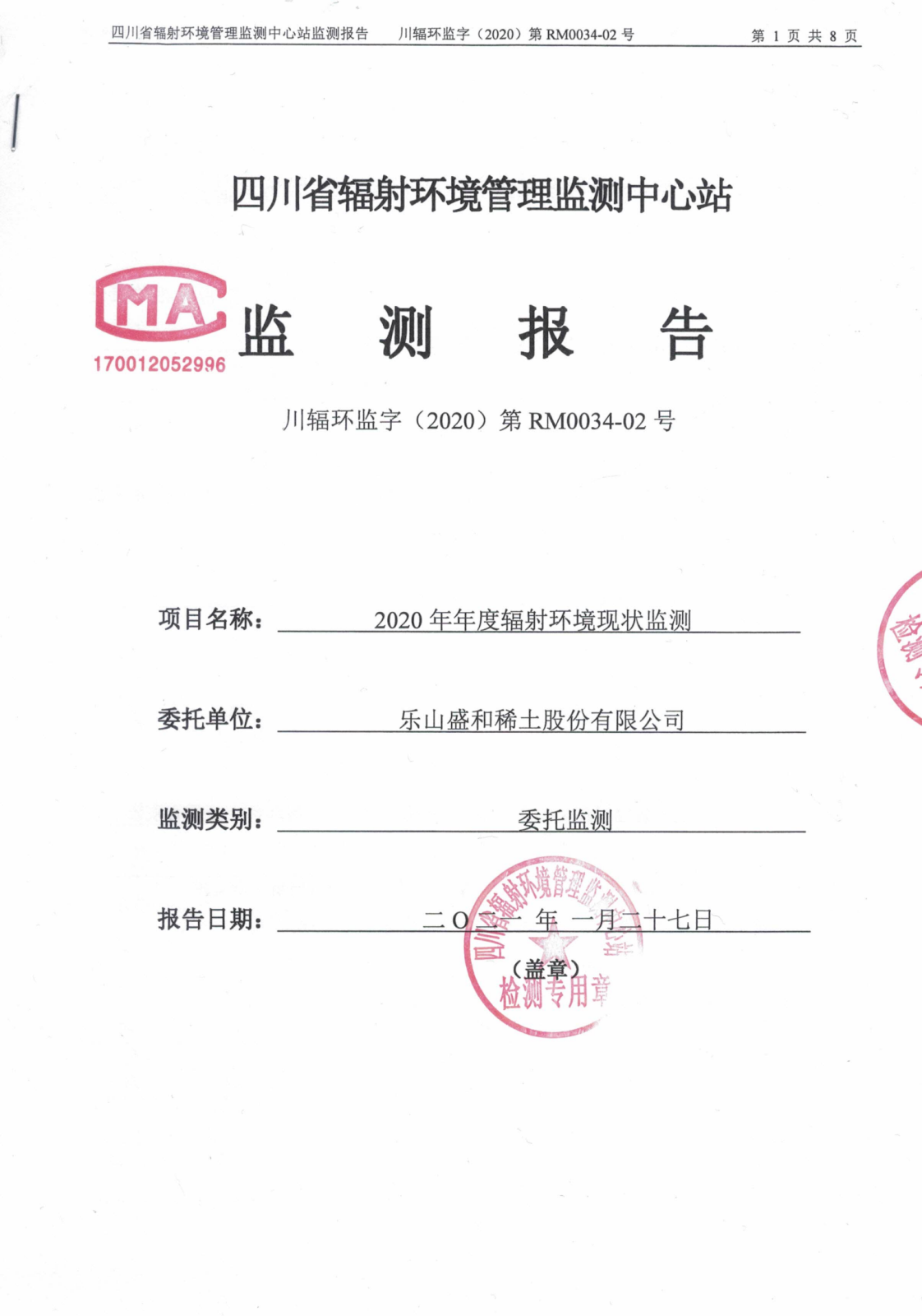 乐山盛和2020年年度辐射环境现状监测报告