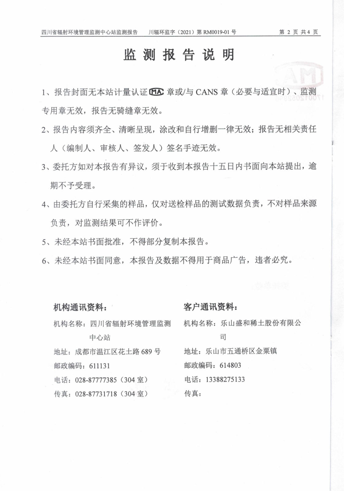 乐山盛和稀土股份有限公司2021年1月份生产废水放射性水平监测报告